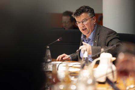 Max Lucks, Sprecher für Menschenrechte und humanitäre Hilfe (Bündnis 90/Die Grünen Bundestagsfraktion), betonte in seiner Begrüßung die enge Verflechtung von Sport und Politik. Mit Blick auf die USA stellte er die Frage in den Raum, für wen die WM angesichts der Einschränkungen von Freiheitsrechten und möglichen Zugangshürden für Fans und Teilnehmende sicher sein wird. Lucks stellte klar, dass menschenrechtliche Sorgfaltspflichten ernst genommen werden müssten und nicht zu Lippenbekenntnissen verkommen dürften.